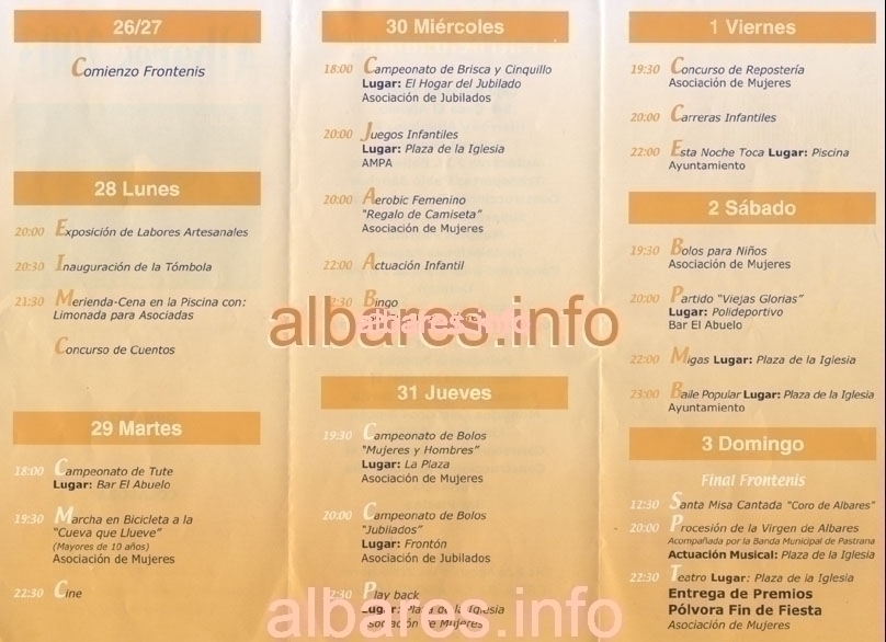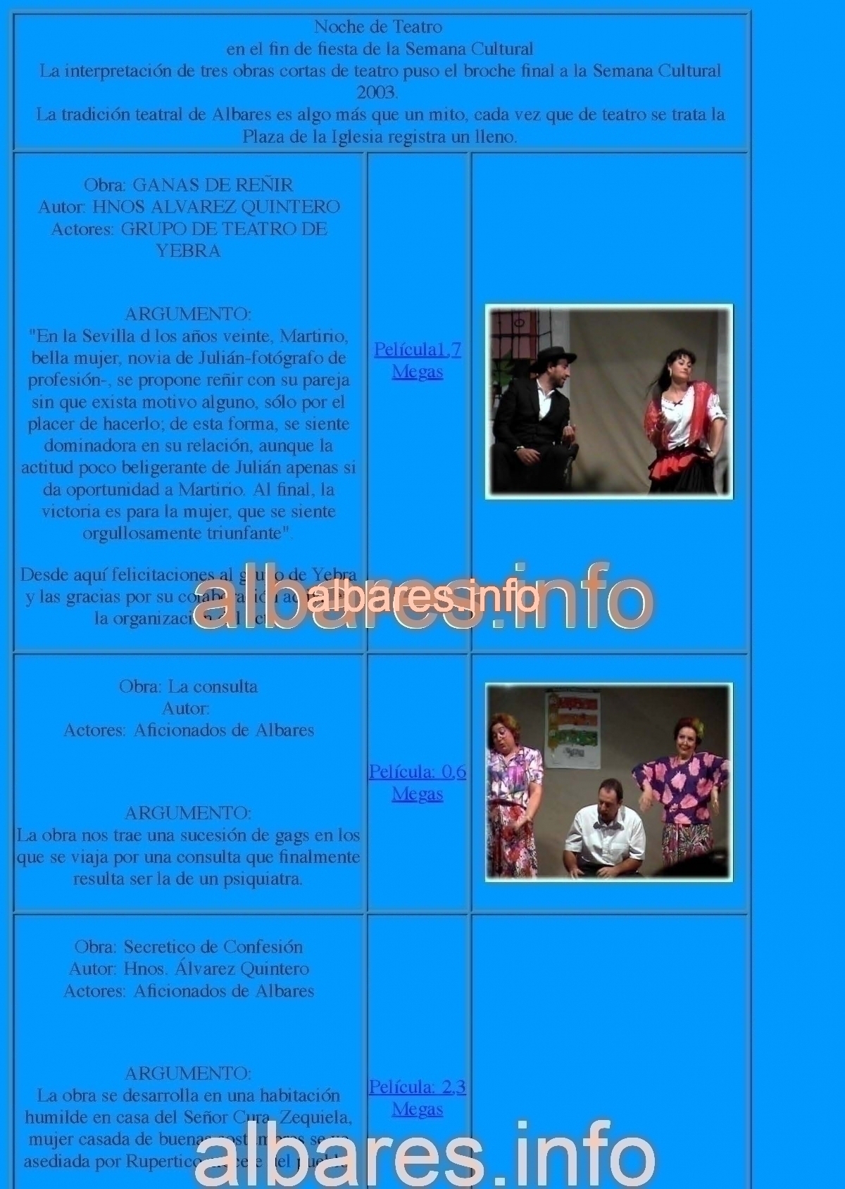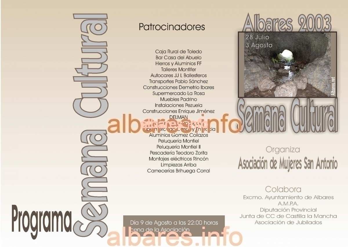 Semana Cultural 2003 Autor de la entrada:Editor Publicación de la entrada:26/08/2015 Categoría de la entrada:Fiestas / Semana Cultural / Verano Cultural Última modificación de la entrada:09/03/2025 Tiempo de lectura:1 minuto de lectura Ganas de Reñir La Consulta Secretico de Confesión Semana Cultural 2003 Etiquetas: Semana Cultural Leer más artículos Entrada anteriorSemana Cultural 2002 Siguiente entradaSemana Cultural 2004 También podría gustarte San Antonio 2018 03/06/2018 Programa de Fiestas de San Antonio 2024 05/06/2024 Descarga el fondo de pantalla de San Antonio para tu móvil 10/06/2024