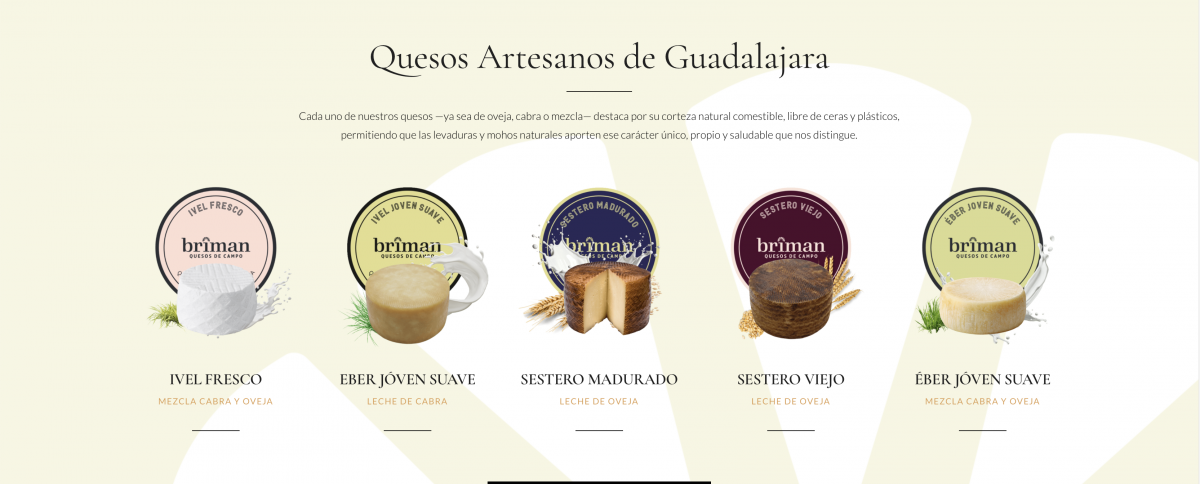 Su gama de productos gira en torno al queso artesano elaborado con leche de cabra y de oveja procedente de su propio ganado, lo que garantiza el control de toda la cadena productiva, desde el pasto hasta la mesa. Entre sus elaboraciones se encuentran quesos frescos, tiernos, semicurados y curados, que representan lo mejor de la tradición quesera de la Alcarria. La calidad de sus quesos ha sido reconocida en ferias de referencia del sector, como el Salón Gourmets de Madrid, donde Quesería Briman ha participado junto a otras empresas agroalimentarias de Guadalajara bajo la marca «Alimentos de Guadalajara».