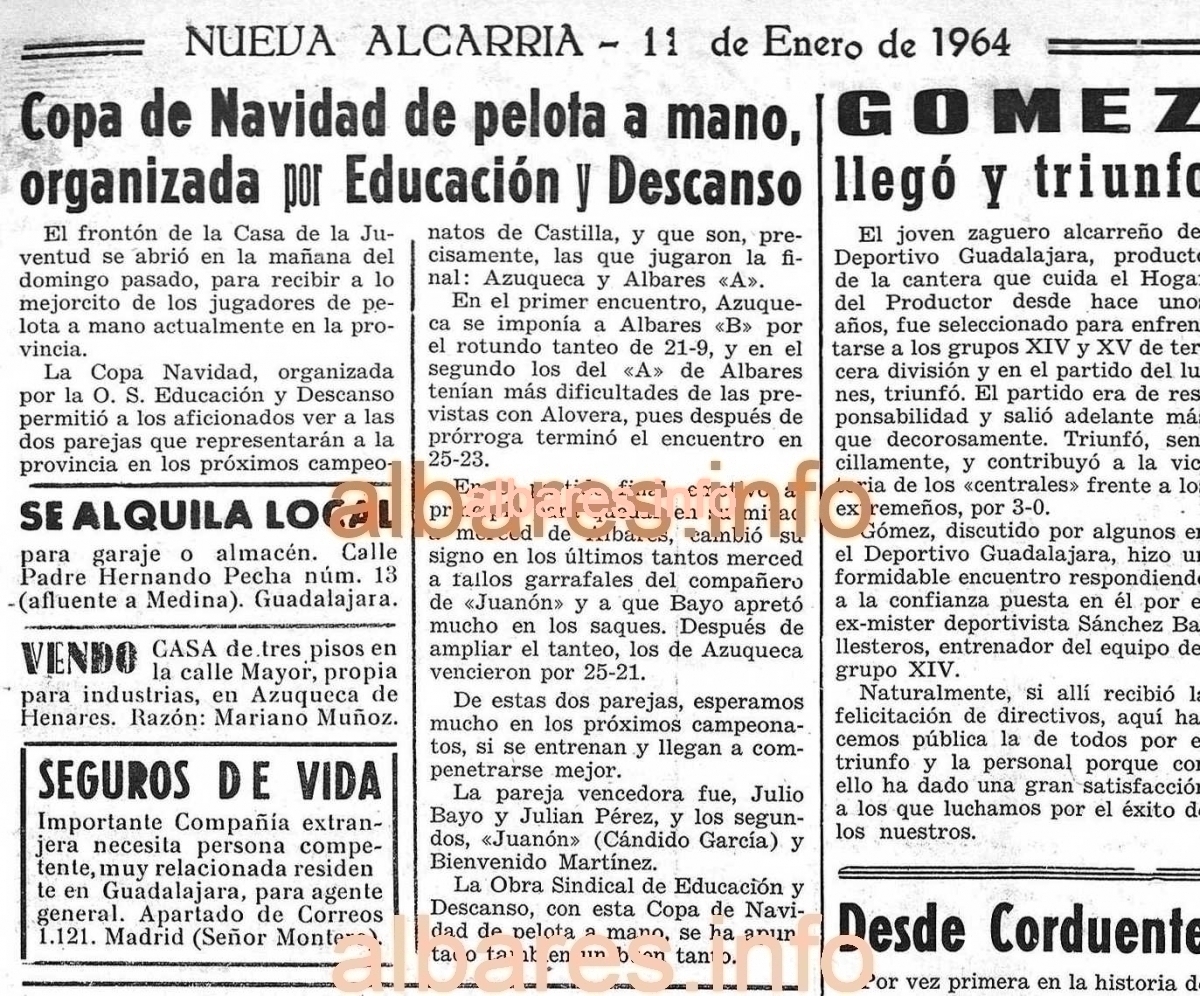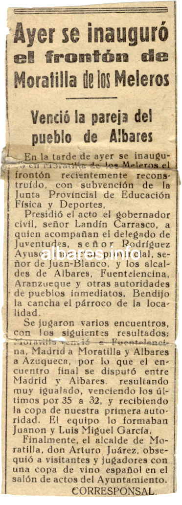 Al año siguiente, Juanón y su primo Luis Miguel participaron en la fiesta de inauguración del frontón de Moratilla de los meleros. Vencieron al equipo de Azuqueca en el primer partido y a los campeones de Castilla en la final, en presencia del gobernador civil de Guadalajara.